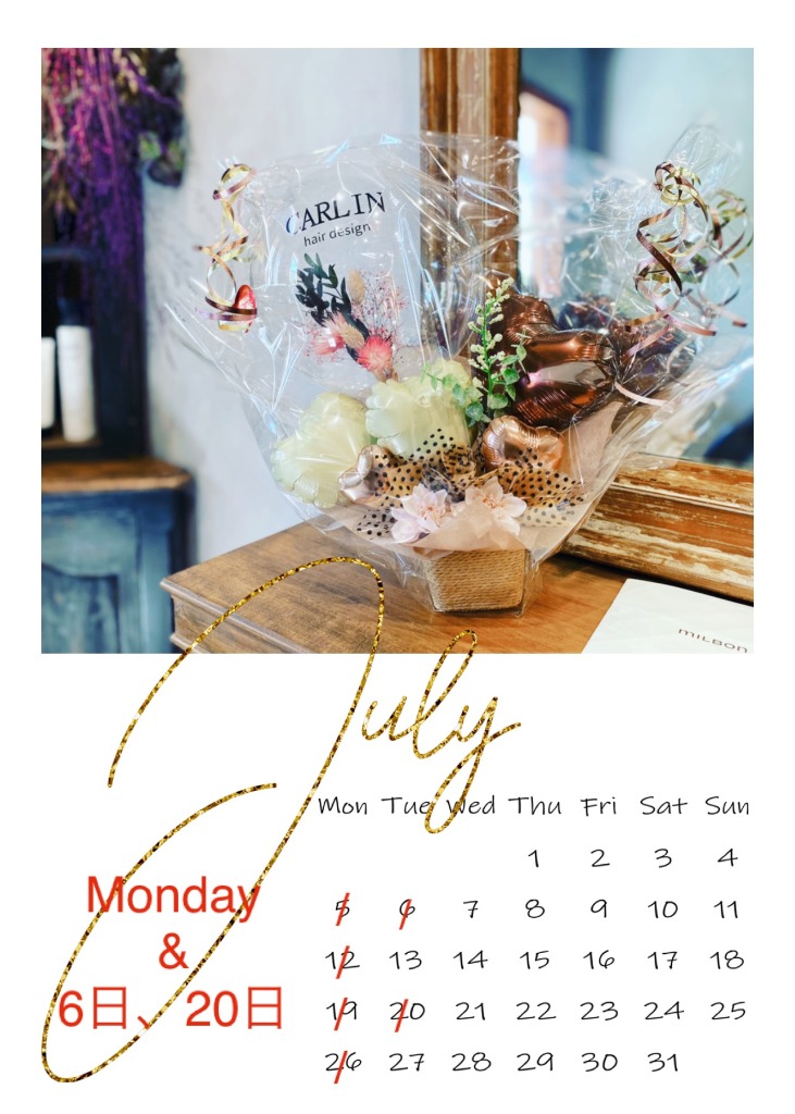 7月は月曜日と、火曜日は6日、20日がお休みさせて頂きますのでどうぞ宜しくお願い致します。