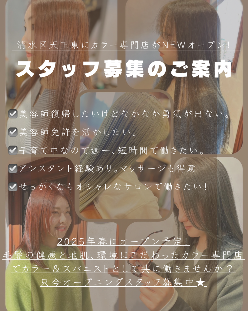 美容師免許をお持ちの方であれば、ブランクがある方も、週1時短などでダブルワークしたい方、お子様がいてシフトが心配な方の勤務もできる限り希望に添えたいと思います。