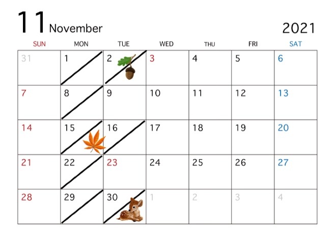 11月は月曜日、2日、16日、30日をお休みとさせていただきますのでよろしくお願いします。