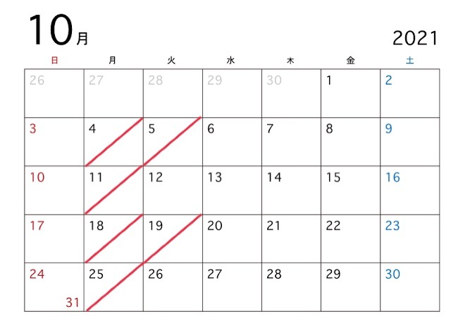 10月は月曜、5日、19日をお休みとさせていただきますのでどうぞよろしくお願いいたします。